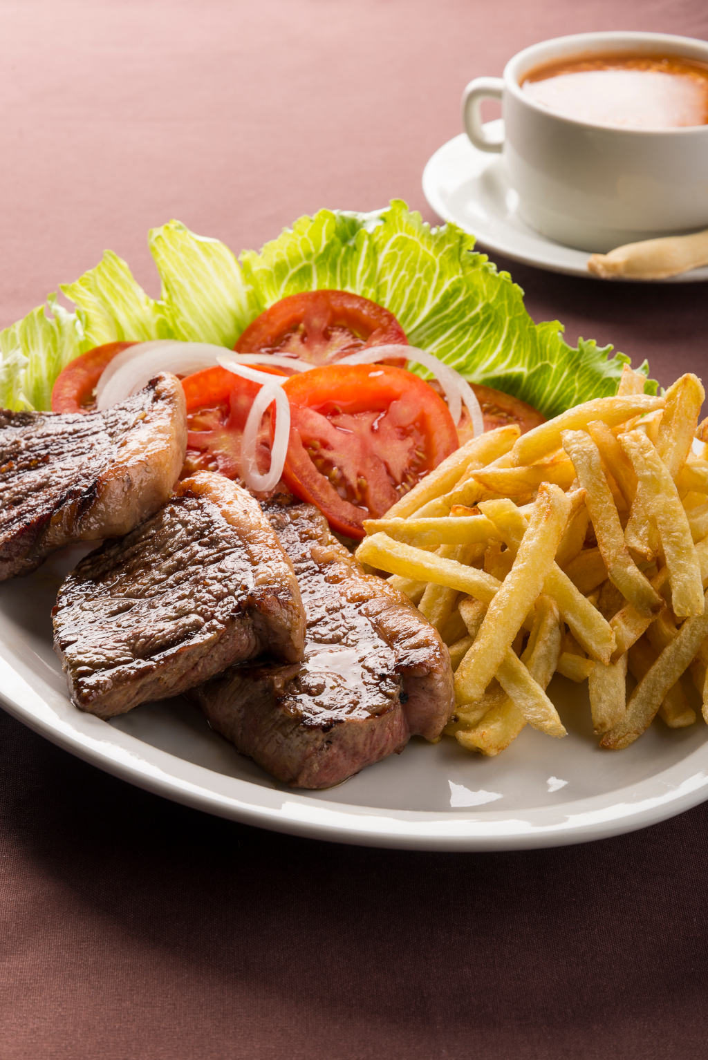 ¾ lb. de carne acompañada de ensalada o puré o papas fritas ( 1 guarnición).
